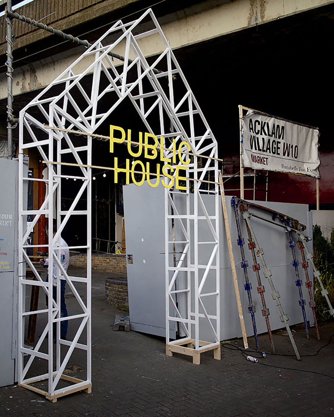 An interactive installation for London Borough of Kensington and Chelsea’s InTRANSIT Art and Performance Festival in collaboration with You&me. We were commissioned to design the focal installation for the festival’s site in Portobello Road, London. Public House provides a stage and backdrop to host the festival’s wide programme of performances. The installation combines a series of interactive components that create scaled versions of characteristic elements within the city combined with domestic functions: a kitchen in a park; a living room on the pavement. The large scale interventions across the site allow public to inhabit a part of their public realm in a new way through familiar domestic surroundings.