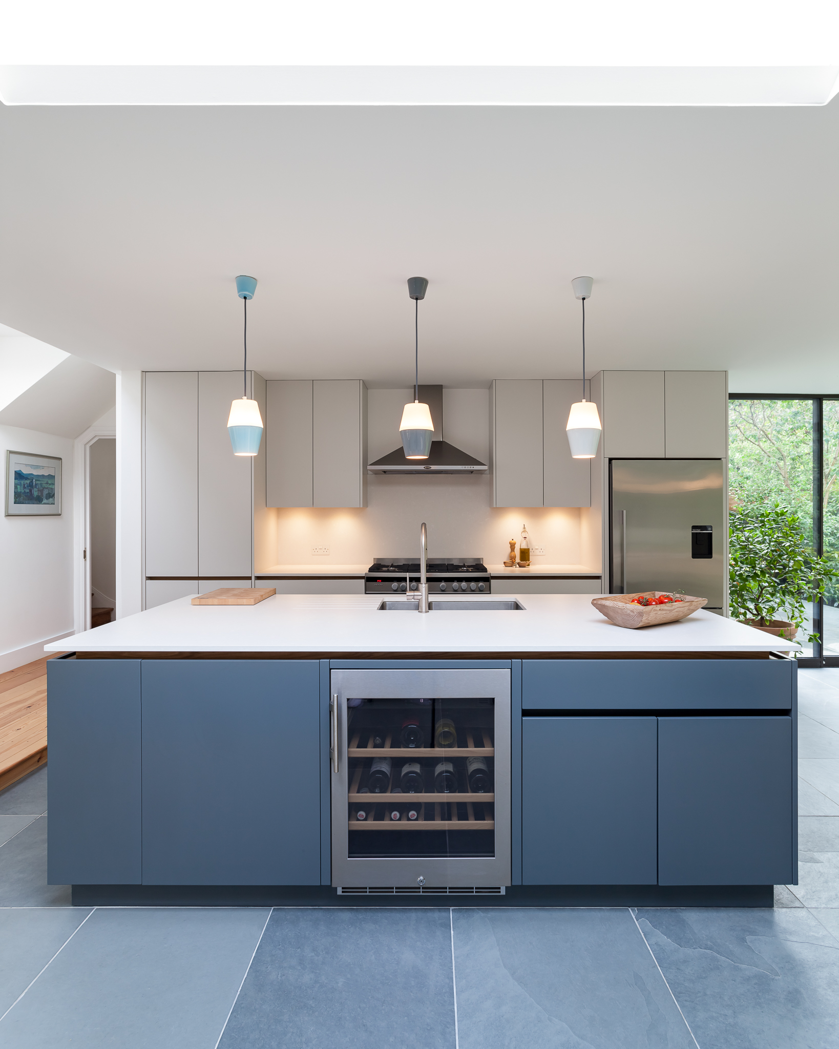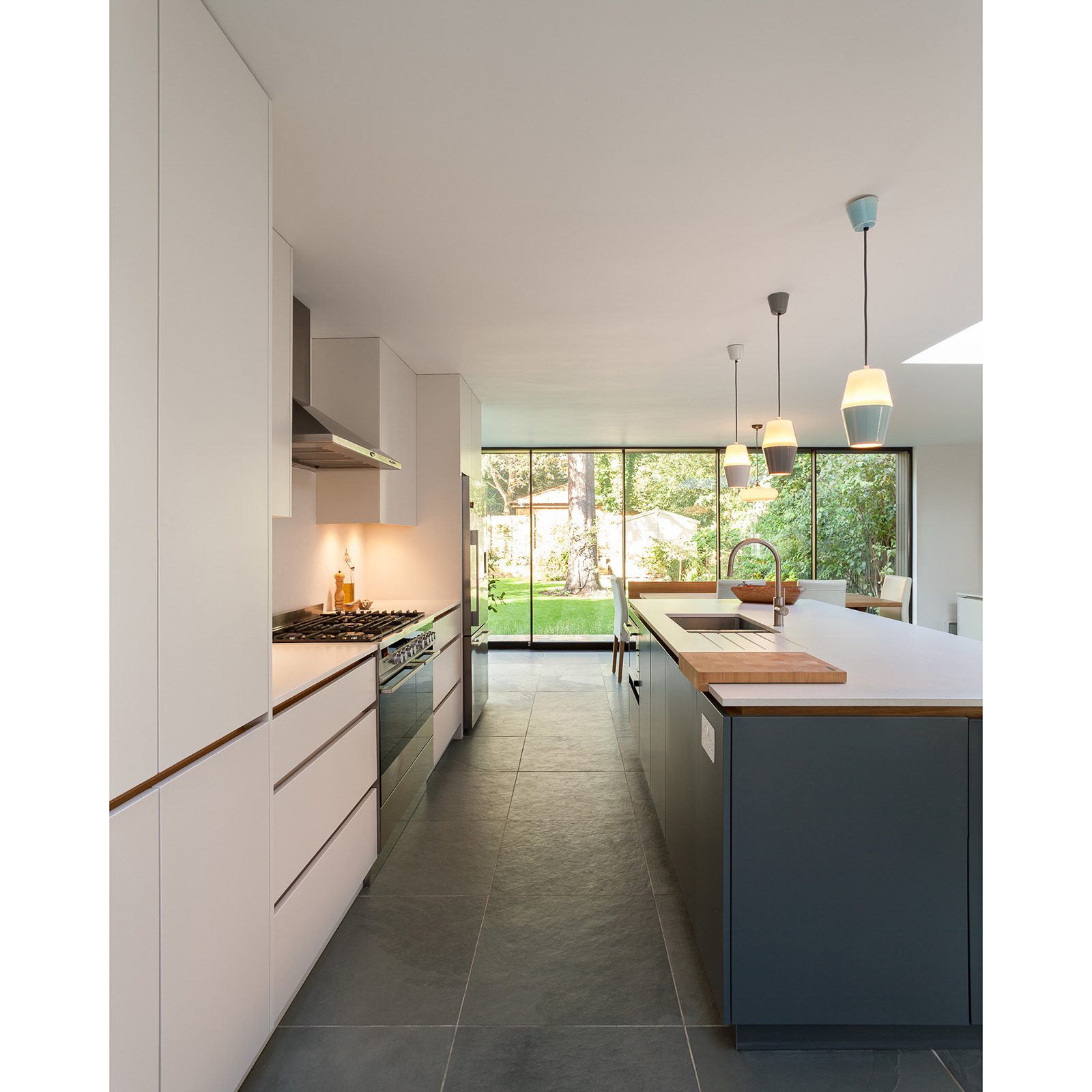 The garage was transformed into a beautiful kitchen and dining space, connected to the terrace and garden by a stylish cantilevered roof. The project encompassed meticulous internal and external decoration, bespoke joinery, and custom-made furniture.